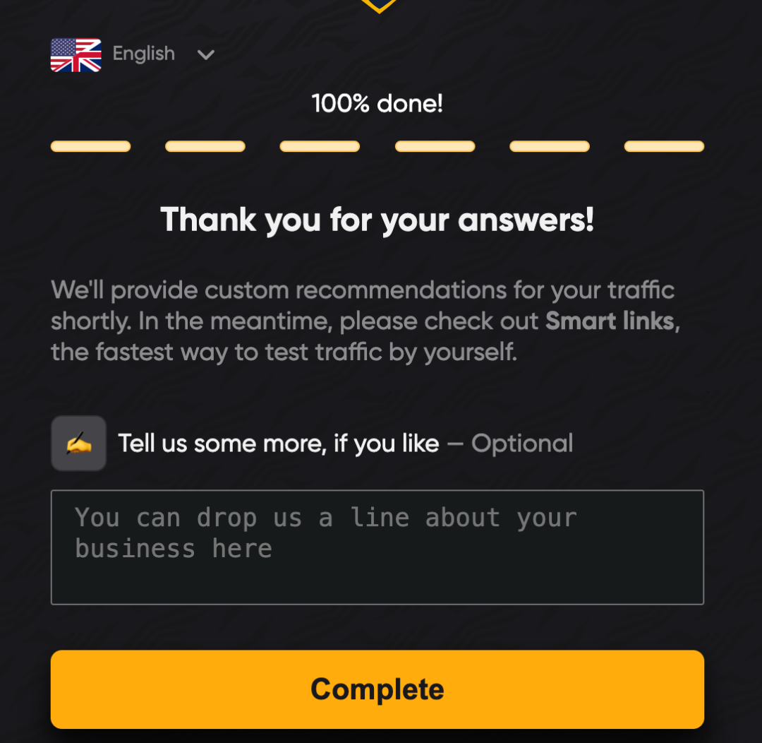 然后就完事了,最后他希望通过智能链接来开始测试你的网站,根据自己情况可以进行,然后点击complete完成。