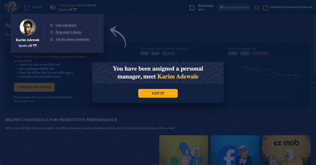然后就进入后台了,进入后台就提示给我分配了一个联盟经理,这个人大家其实可以多跟他互动获取好感,然后给你一些还不错的任务。