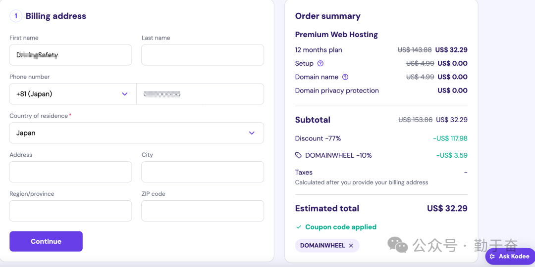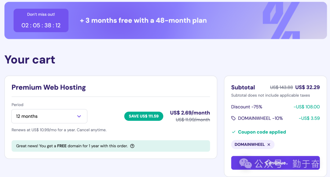 算下来费用差不多要32.29美元,送一年的域名使用权限,一年到期之后续费是10.99每个月,估计域名的费用需要后续再次算钱了。