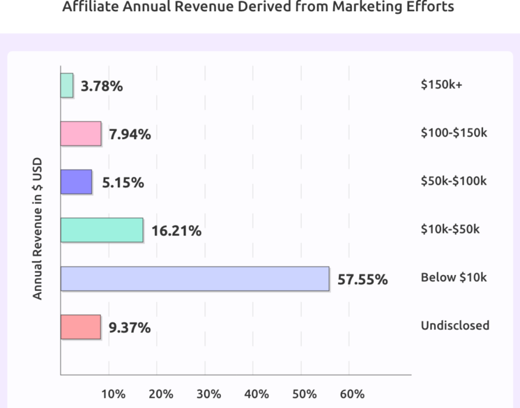 换句话说,超过一半的联盟营销人员每年收入为 1 万美元或更少,而只有约 33% 的联盟营销人员每年收入为 1 万美元或更多。