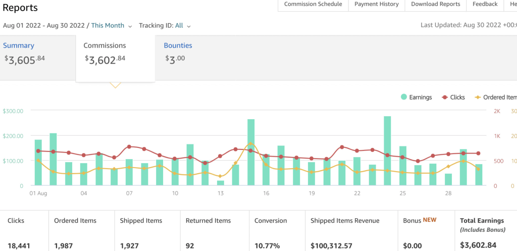 例如,如果您的博客上有一个联盟链接,引导用户从亚马逊购买产品,那么每次点击链接后,您都会从中抽取一定比例的佣金。控制面板如下: