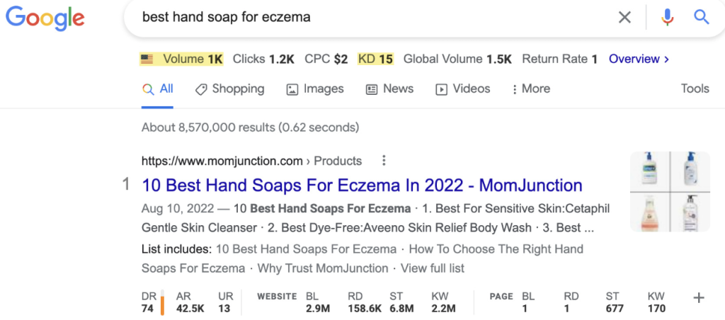 SEO 工具栏将显示有关您搜索的每个关键字的信息,例如每月有多少人搜索该关键字以及排名的难度。