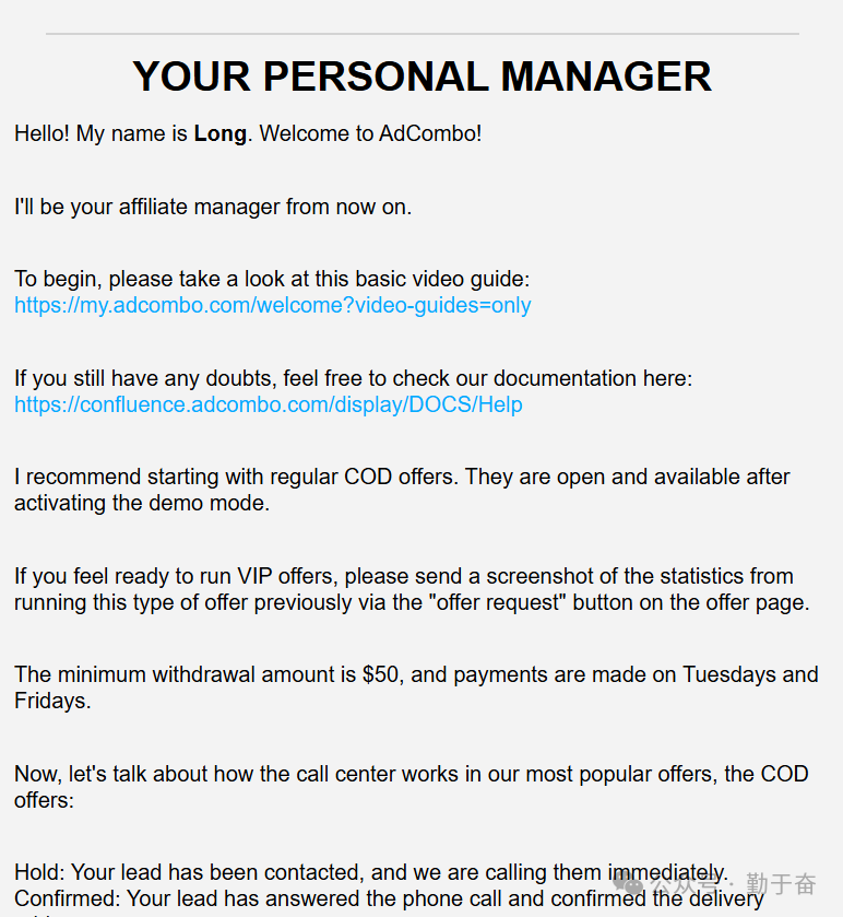 这个是联盟经理发我的一封邮件,给我说他们最低付款是50美金,并且是每周二和周五打款,如果实力在还可以跟联盟经理商量打款时间。