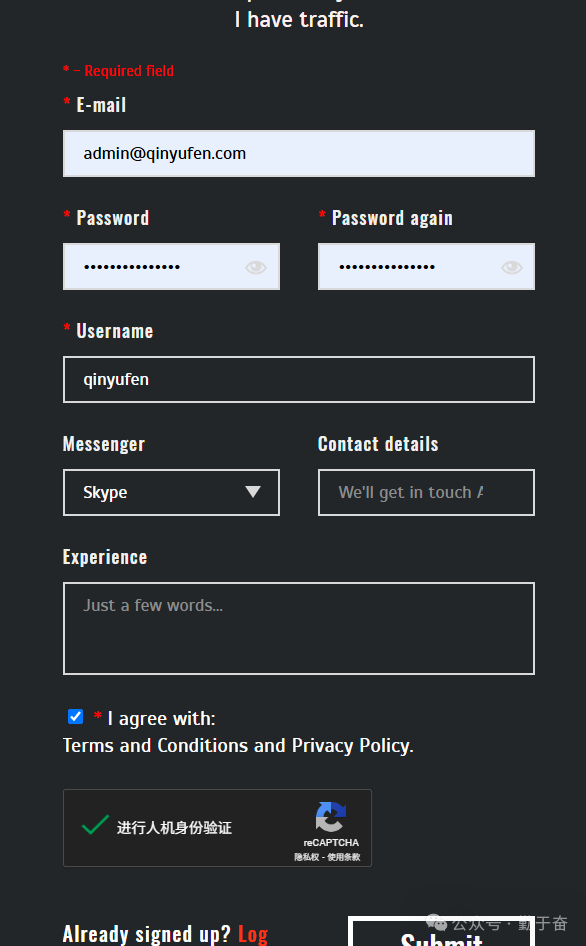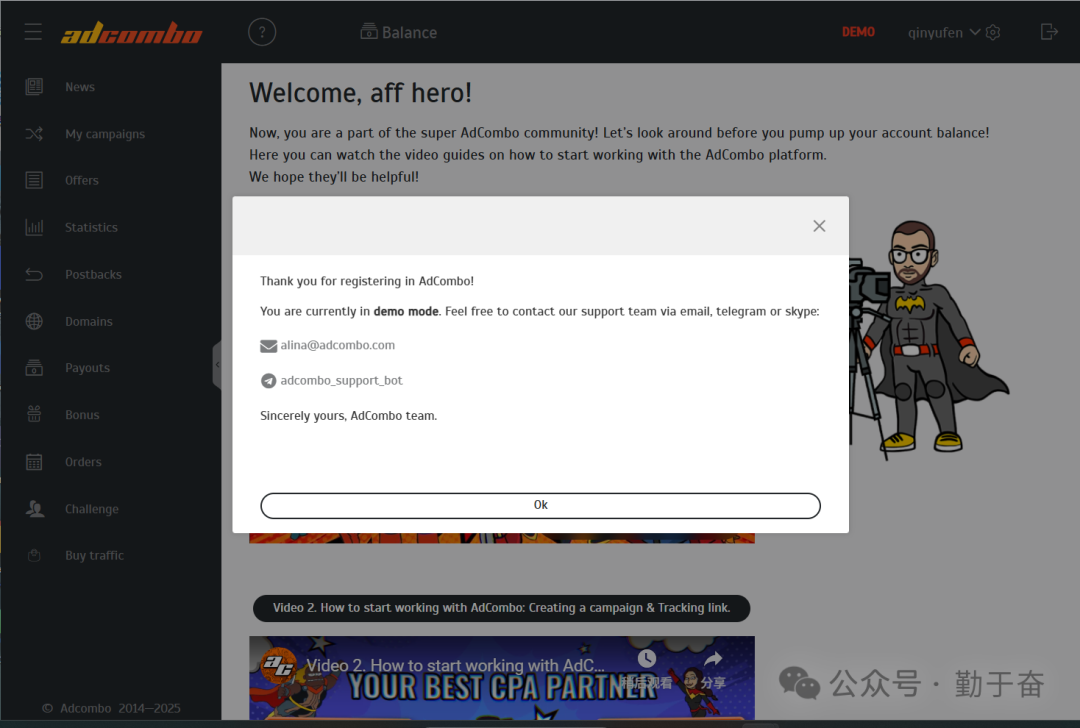进入后台会提示你,这个只是演示页面,需要通过邮箱或者skype联系联盟经理,进行账号激活,也可以直接通过tg联系他们。