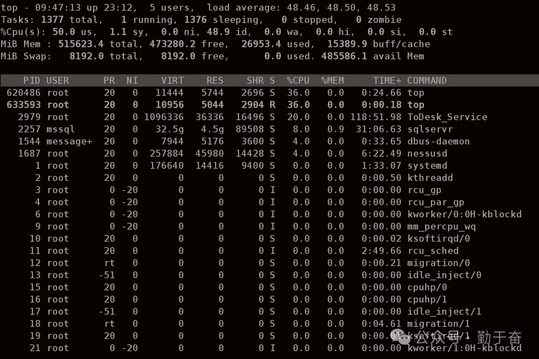 根据上图的信息,几乎所有的 CPU 核心都在接近或全占用的状态,主要是由用户进程(us)占用。这可能表明系统上运行了大量的 CPU 密集型任务或进程。
