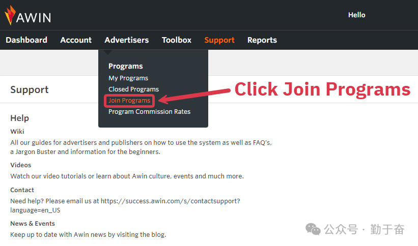 在 Awin 上可以轻松找到适合您的领域和地区的最佳联盟计划。通过单击“广告商”下拉菜单中的“加入计划”来开始搜索,以显示您尚未加入的 Awin上所有联属计划的列表。