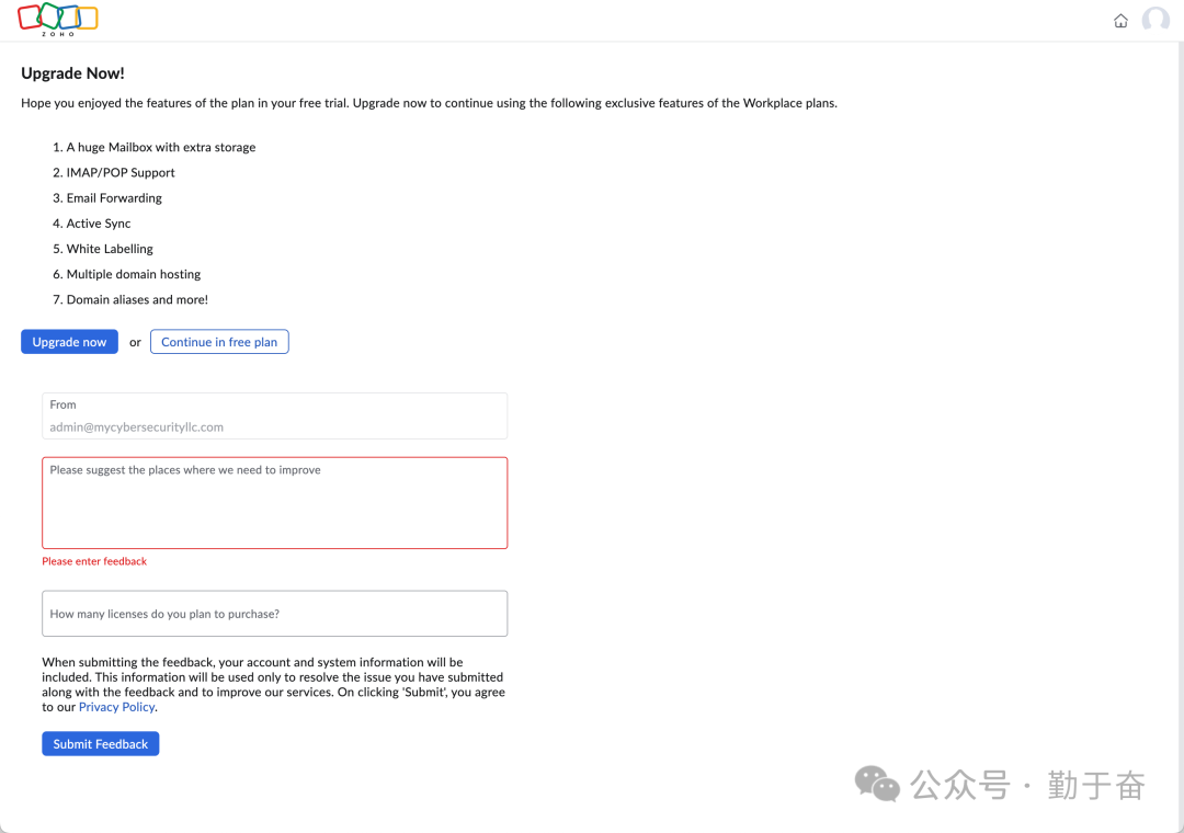 今天进来提示要你升级账号,也就是你之前使用的是免费的,这里我当然继续使用free计划,然后输入你的意见,提交就进入邮箱了。