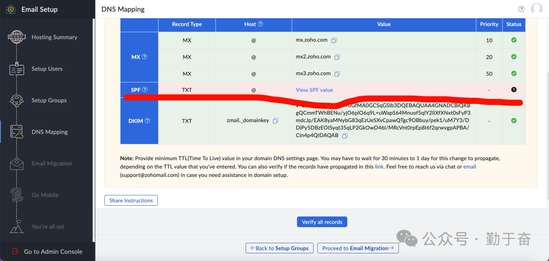 这个错误提示spf有问题,需要检查一下解析,去域名后台看看解析是不是有问题,这里需要点击view spf value 然后记得复制全部内容去域名后台添加txt。