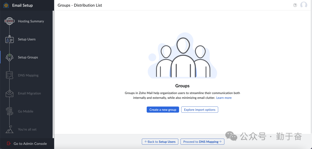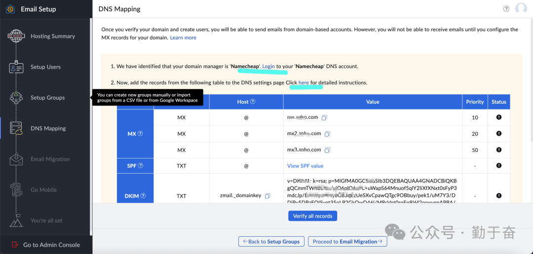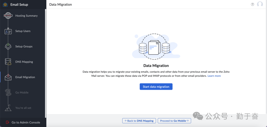 这一步提示有没有其他地方的邮箱内容需要转移过来的,如果没有就继续下一步,所以域名邮箱搭建很简单,就是在域名后台解析一些值就可以了。